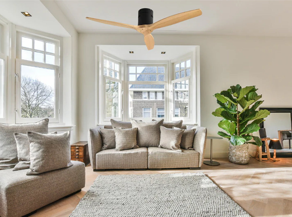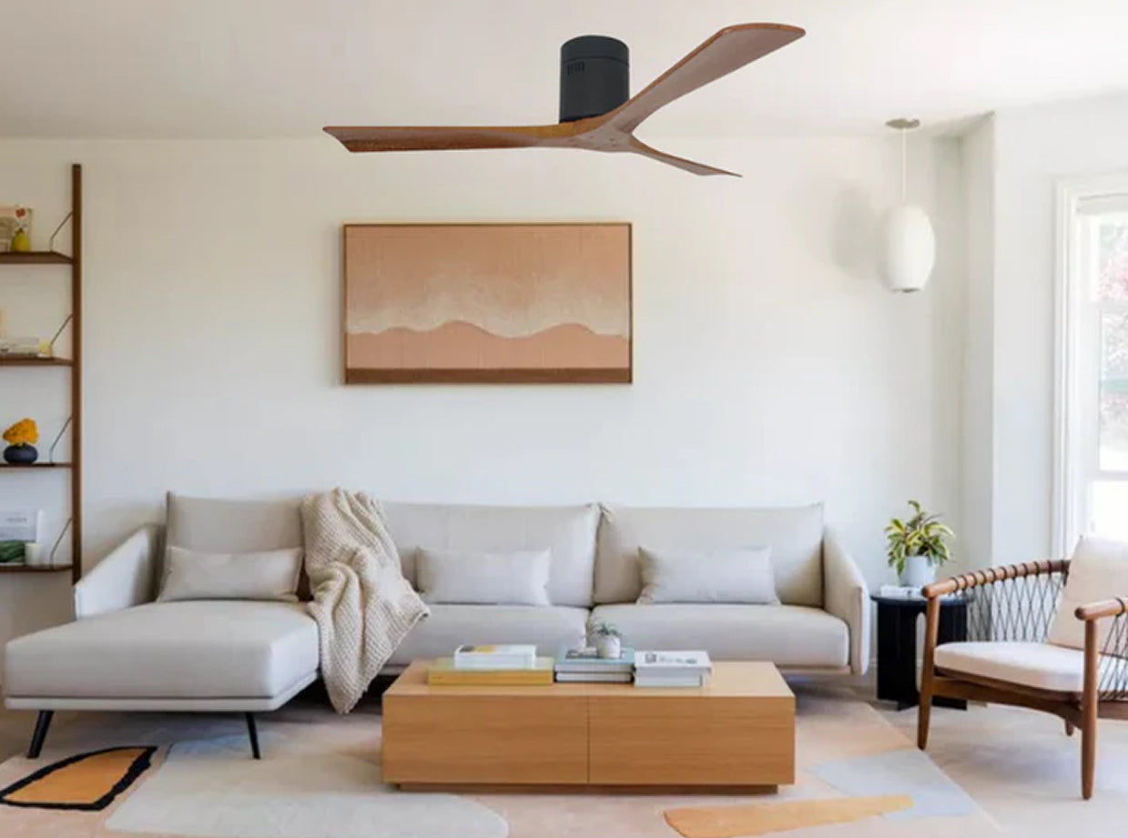 Ventilador de techo de aspas planas. Diseño minimalista para espacios modernos. Disponible en nogal, negro y ceniza.